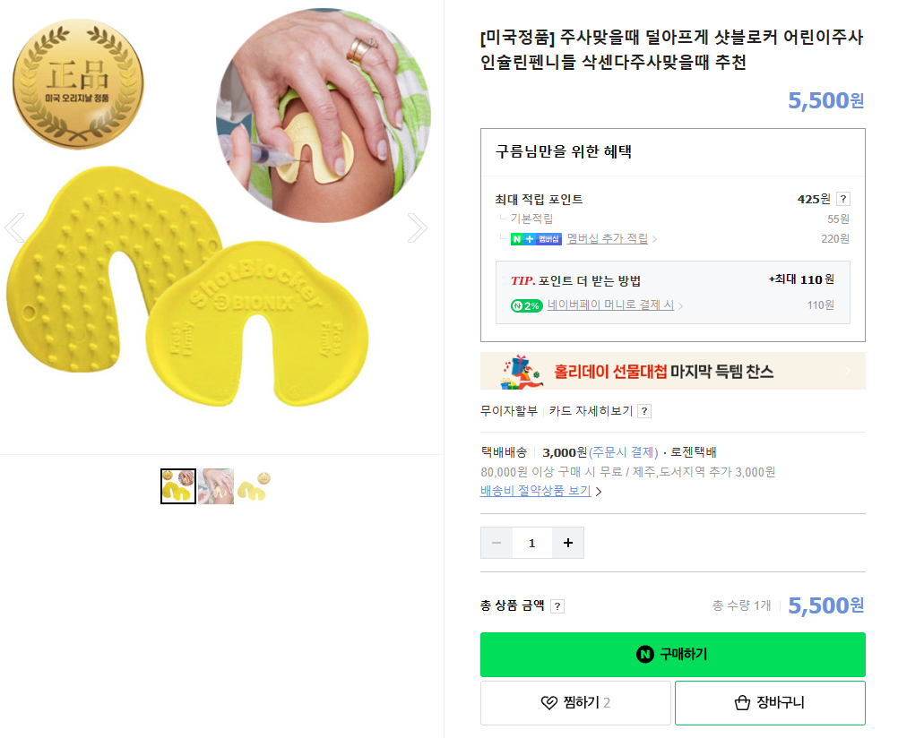 주사를 맞기 힘들어 하는 아이들은 이 도구를 사용하면 좀 수월하다는 글을 읽고 얼른 구입해 보았다.
