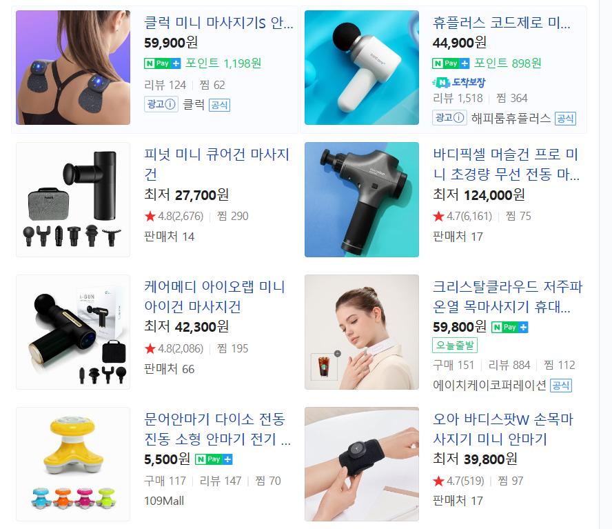 쇼핑창을 검색해 보면 다양한 가격과 기능의 안마기가 있습니다.