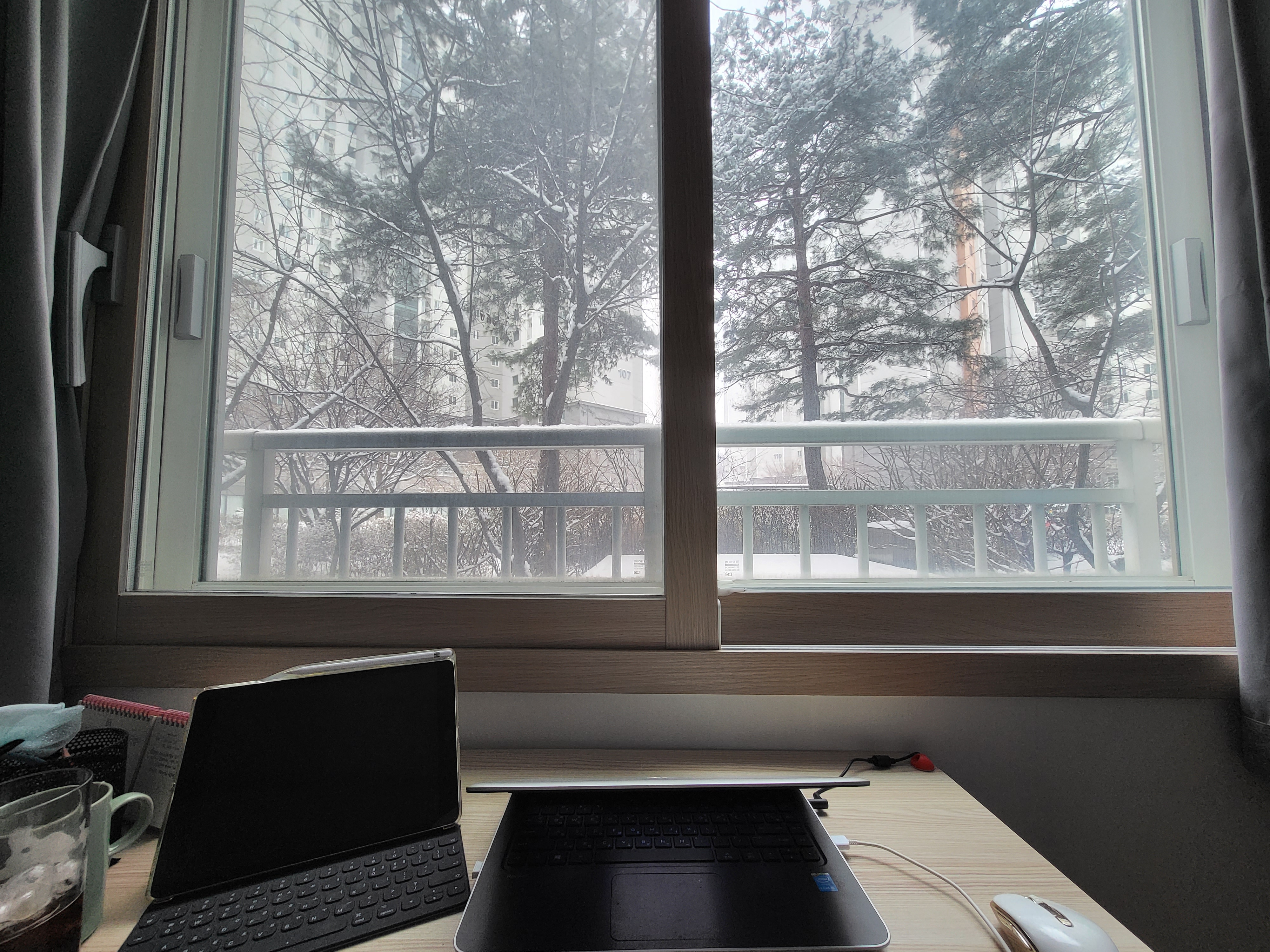 창밖에 눈이 온다. 이렇게 눈 내리는 경치를 보며 글을 쓰고 있으니