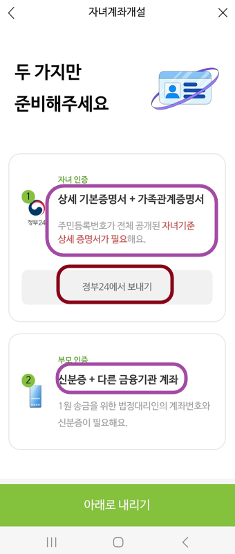 하지만 엄마의 가족관계증명서와 아이의 기본증명서가 전자문서 지갑에 잘 들어가 있어야 한다던지,