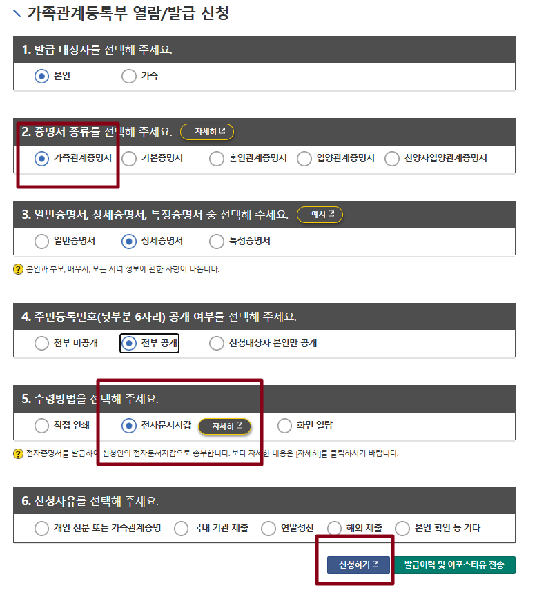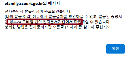대한민국 법원 전자가족관계등록 시스템에 들어가서 가족관계증명서를 발급진행 중
