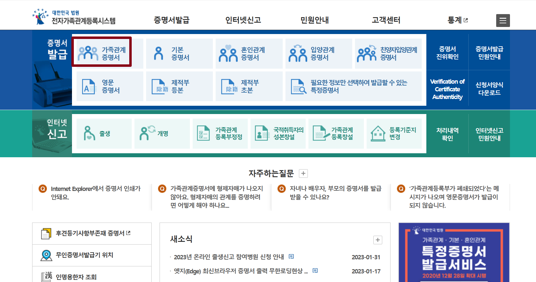 법원 전자가족관계 등록 시스템 가족관계 증명서 클릭
